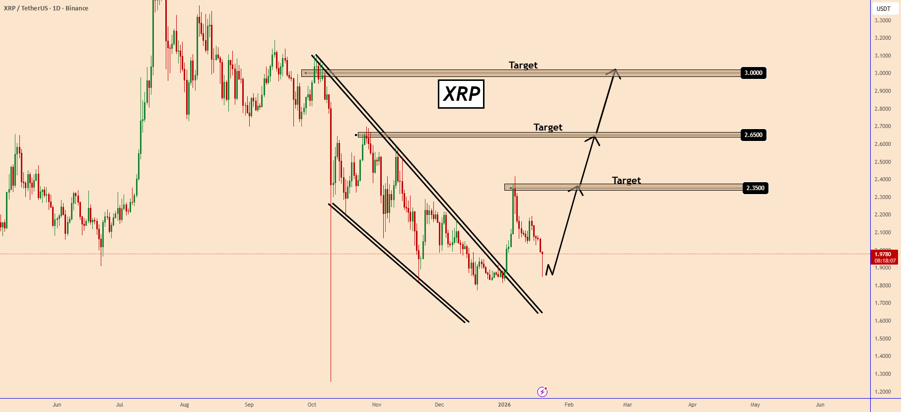 XRP wird in einem gut definierten bullischen Wedge-Muster gehandelt, das eine Korrekturphase nach dem vorherigen impulsiven Anstieg darstellt.