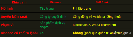 Tóm lại : Binance là công ty, còn BNB Chain là mạng lưới phi tập trung mà cộng đồng vận hành. Dù Binance đặt nền móng và tiếp tục đóng góp nhưng chuỗi này không thuộc sở hữu hoặc kiểm soát trực tiếp bởi Binance.