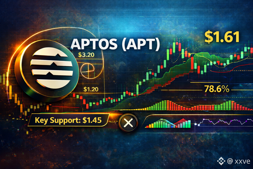 Aptos ($APT ) is currently trading near a critical structural support zone, with price hovering around $1.61 after an extended period of bearish pressure. This region represents a high-risk, high-reward decision area, where historical demand, volume concentration, and long-term technical levels converge.In this technical analysis, we evaluate #APT using a multi-layered technical framework, incorporating market structure, Fibonacci retracement levels, exponential moving averages (EMA), RSI, MACD, Ichimoku Cloud, Volume Profile, and On-Balance Volume (OBV). The objective is to determine whether the current price action signals seller exhaustion and potential accumulation, or if the market remains vulnerable to further downside continuation.This report aims to provide traders and analysts with a clear technical roadmap, highlighting key support and resistance levels, momentum behavior, and conditional scenarios to navigate the current market environment effectively.