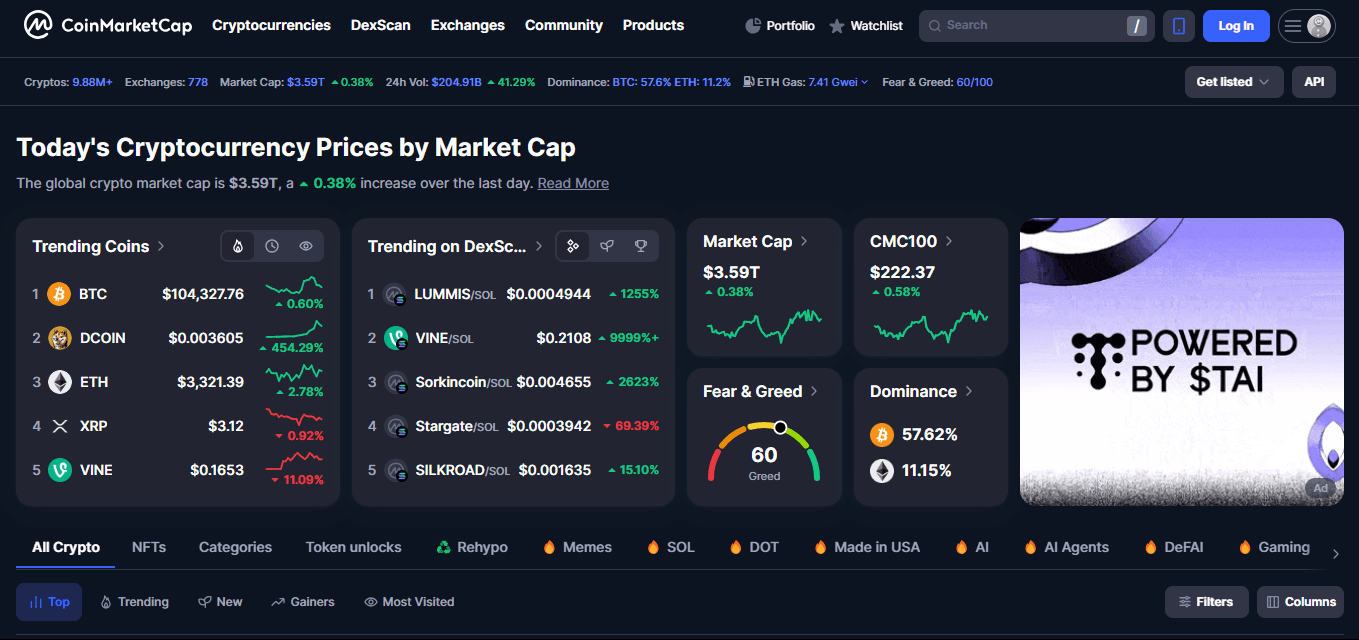 Obwohl erfahrene Händler woanders nach tiefergehenden Chart-Overlays suchen, eignet sich die schlanke Benutzeroberfläche von CoinMarketCap für diejenigen, die sofortige Referenzpunkte benötigen oder die breitere Krypto-Leistung überprüfen möchten.