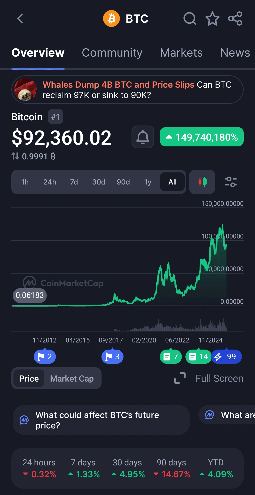 Obwohl CoinMarketCap nicht so ausgeklügelt wie TradingView ist, bleibt es eine bevorzugte Seite für schnelle Daten zu Marktkapitalisierung, Preisbewegungen, Handelsvolumen und insgesamt Markt-Rankings. Die Diagrammfunktion ist einfach, aber ausreichend für eine Analyse auf oberster Ebene, sodass Sie mehrtägige oder mehrmonatliche Trends auf einen Blick erkennen können. Benutzer können verschiedene Token leicht vergleichen, eine Beobachtungsliste verwalten und relevante Links erkunden.