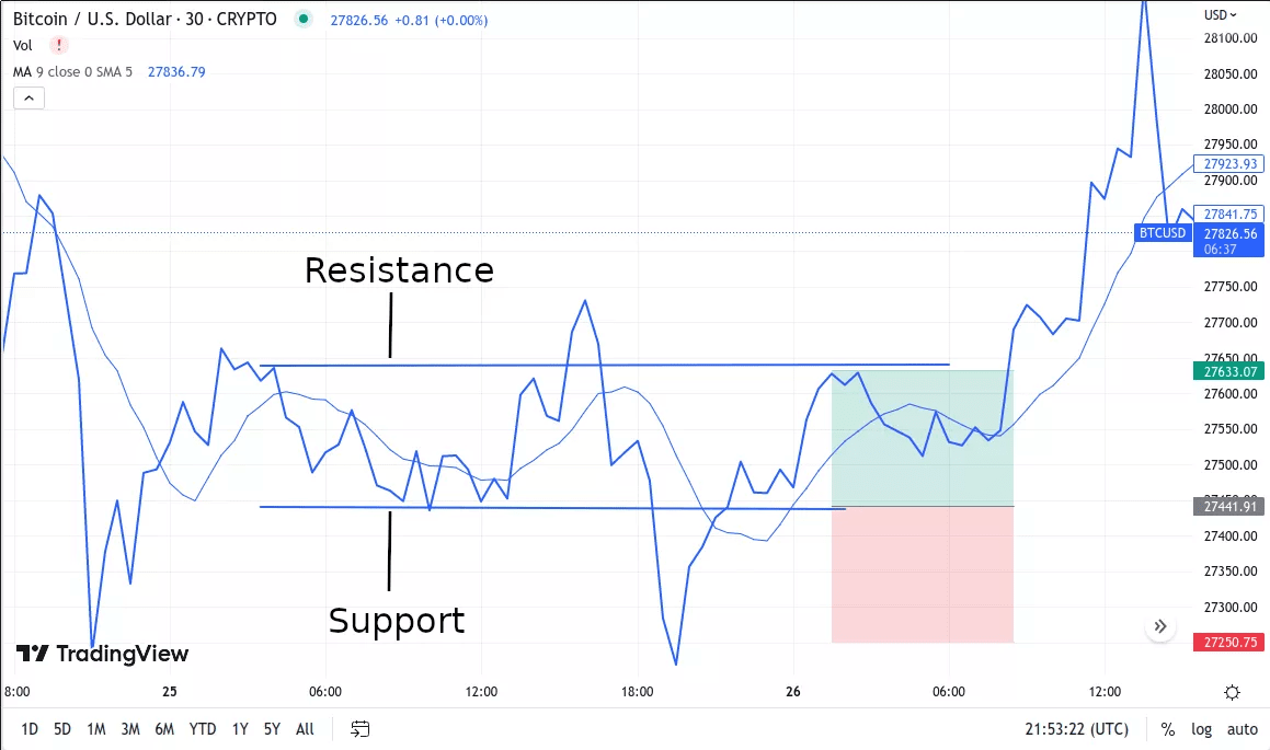 Widerstand ist das Gegenteil von Unterstützung. Häufig stagnieren die Preise oder kehren um, wenn sie eine wichtige Widerstandslinie erreichen. Verkäufer tendieren dazu, auf diesen Niveaus zu dominieren und hindern das Asset daran, höher zu steigen. Sobald der Preis starken Widerstand durchbricht und darüber hält, kann diese Zone zu einem neuen Unterstützungsbereich werden, was auf potenzielles bullisches Momentum hinweist.