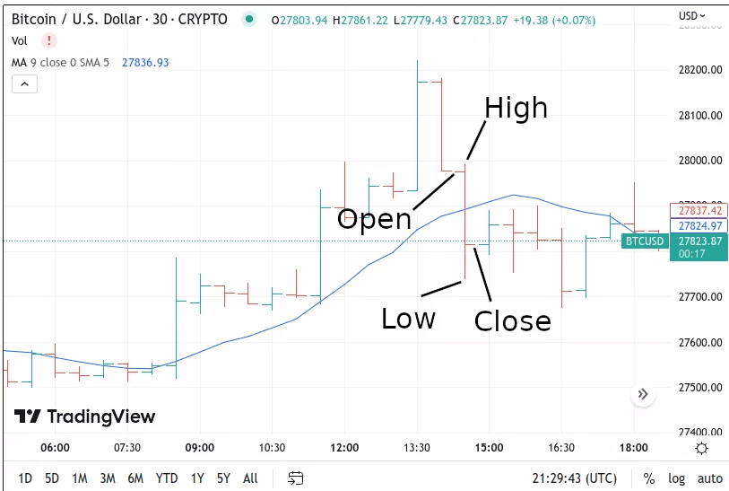 Kerzencharts bieten einen visuellen Überblick über Eröffnungs-, Höchst-, Tiefst- und Schlusskurse, jedoch mit farbcodierten „Kerzen“, die bullische oder bärische Bewegungen widerspiegeln. Grüne oder weiße Kerzen zeigen einen höheren Schlusskurs im Vergleich zum Eröffnungskurs, während rote oder schwarze einen Rückgang zeigen. Kerzen beleuchten Muster, die potenzielle Trendwenden oder Marktstimmungswechsel offenbaren können.