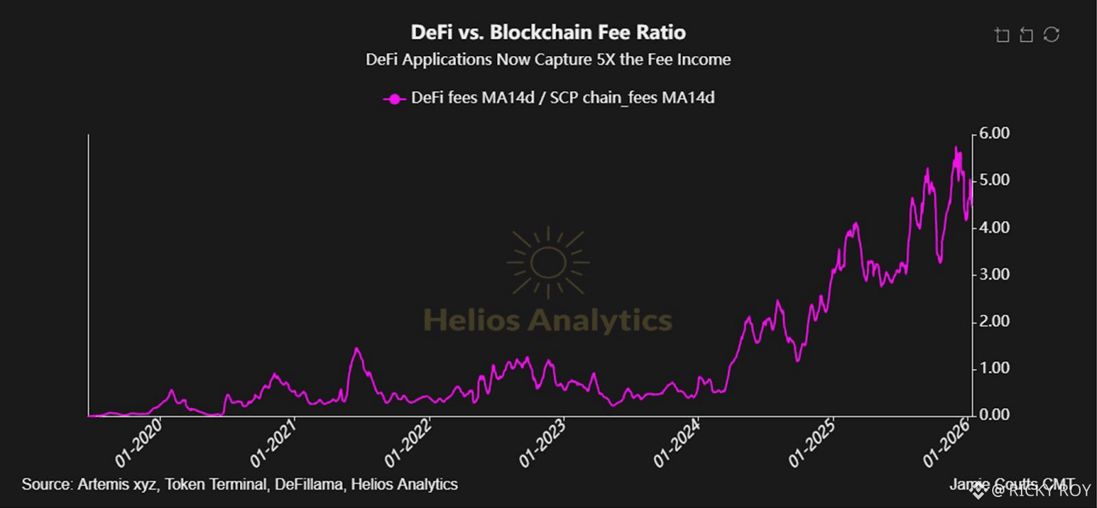Decentralized finance (DeFi) applications now capture five times the fees generated by blockchains, according to data shared by Jamie Coutts, chief crypto analyst at crypto intelligence platform Real Vision.