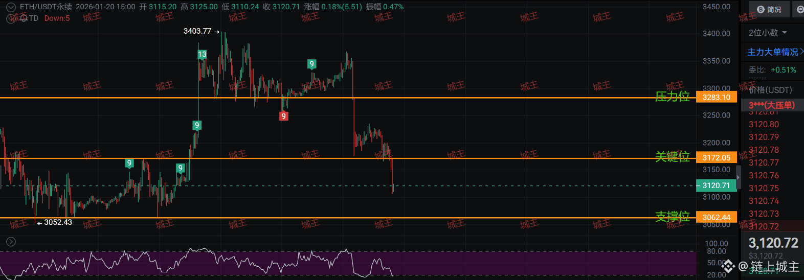 当前ETH价格3120,距离3050的“强支撑”仅70美金。但仔细看成交量——紫色成交量柱在下跌时反而萎缩,说明抛售并非恐慌性出逃,而是主力有计划的压盘。右侧委比+0.51%更暴露了真相:买盘力量正在暗中积蓄!城主在图中用橙色线条标注的3062支撑位,正是主力精心设计的“抄底信号灯”——当价格触及此位,就是散户逆袭的最佳时机!