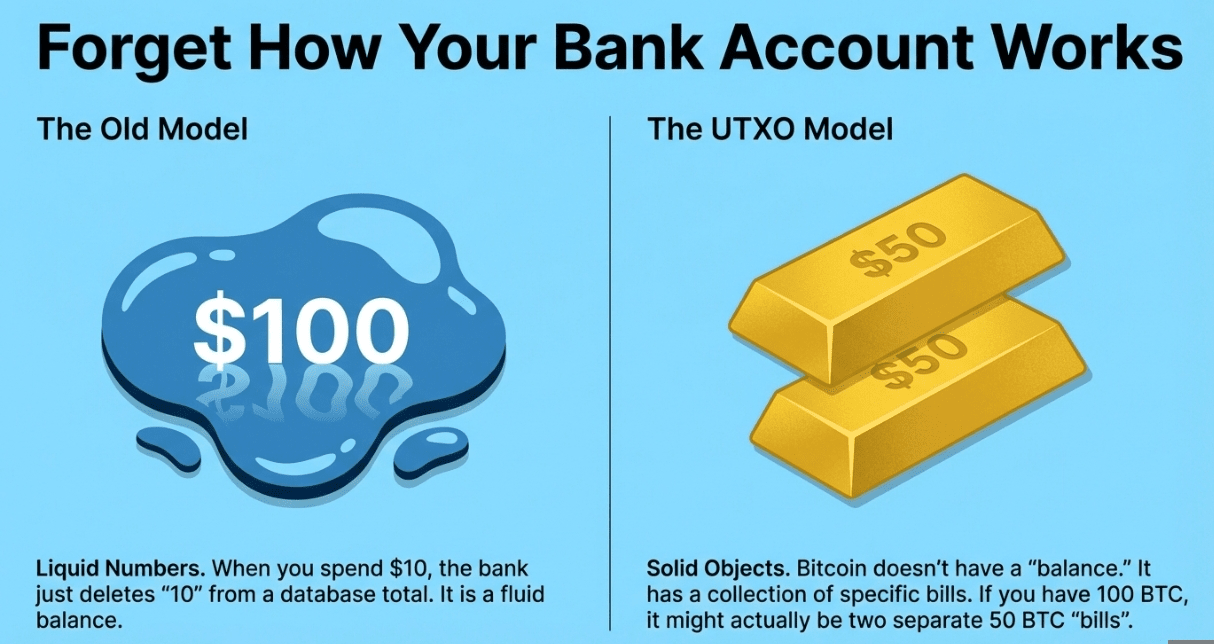 Bitcoin (UTXO): Du hast kein "Guthaben." Du hast eine Sammlung spezifischer Scheine. Du könntest einen $50-Schein und einen $50-Schein haben. Du hast zwei UTXOs.
