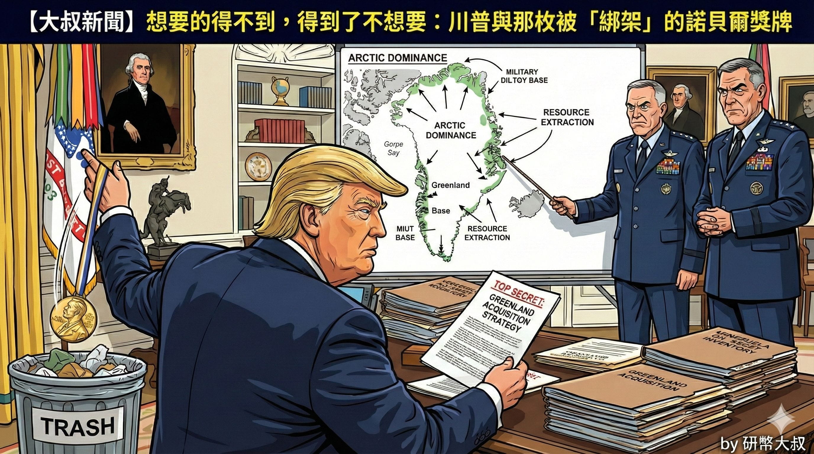 在白宮橢圓形辦公室的權力場域中,物品的擺放位置往往暗示著地緣政治的優先順序。據傳,在 2026 年 1 月 20 日唐納.川普那張堆滿「極機密」文件的辦公桌旁,一只金光閃閃的諾貝爾和平獎獎牌,此刻正遭受著最尷尬的待遇——它既沒有被供奉在顯眼處,也沒有被徹底丟棄,而是像一件談判破局後的抵押品,被隨意擱置在垃圾桶邊緣與格陵蘭併購計畫書之間。