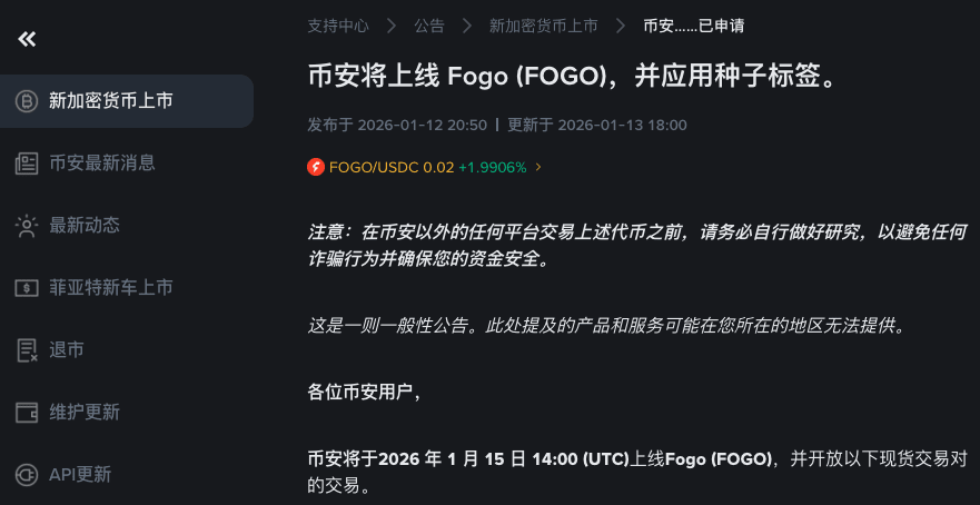Die FOGO-Token sind an mehreren renommierten Börsen gelistet, darunter Binance. Binance hat am 15. Januar 2026 den Spot-Handel für FOGO eröffnet, und die Anfangshandelspaare umfassen FOGO/USDT, FOGO/USDC und FOGO/TRY. Benutzer können eine Stunde nach Veröffentlichung der Ankündigung FOGO einzahlen, um sich auf den Handel vorzubereiten. Die Abhebungsfunktion wird ebenfalls später freigegeben. Darüber hinaus hat Binance FOGO mit einem Seed-Tag versehen, was darauf hinweist, dass es sich um ein frühes Hochrisikoprojekt handelt, bei dem Investoren vorsichtig bewerten sollten, bevor sie teilnehmen.