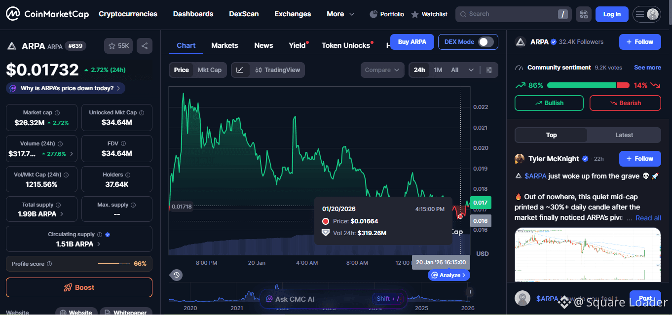 ARPA’s volume has skyrocketed, signaling heavy whale accumulation that ignores the broader macro fear. This is a classic "flight to volatility" where traders seek yield away from the stagnating majors.