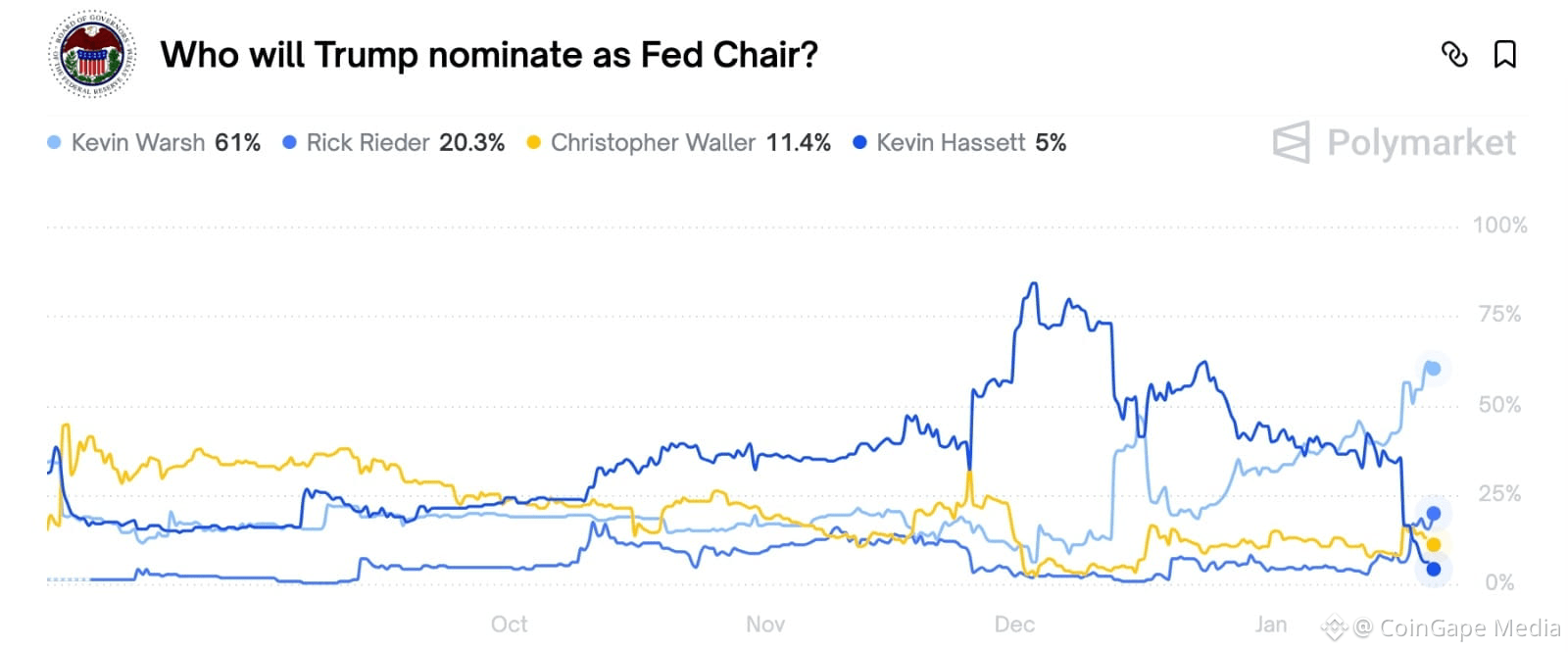 The finalists include Trump adviser Kevin Hassett, Fed Governor Christopher Waller, former Fed Governor Kevin Warsh, and BlackRock bond chief Rick Rieder. As per Polymarket odds, Kevin Warsh leads with 61 percent, followed by Rick Rieder at 20 percent. Christopher Waller holds 11 percent, while Kevin Hassett trails at 5 percent.