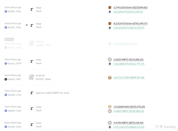 استخدم الحوت العائدات لشراء $ETH . في المجمل، تم الاستحواذ على 724 ETH. بلغت قيمة الصفقة نحو 2.4 مليون دولار. عملية المبادلة شملت خطوات وسيطة عبر أصول عالية السيولة. الهدف كان واضحاً ومباشراً. المحفظة انتقلت بالكامل من المعادن إلى العملات الرقمية. وأصبح إيثريوم الأصل الرئيسي الوحيد بعد الصفقة.