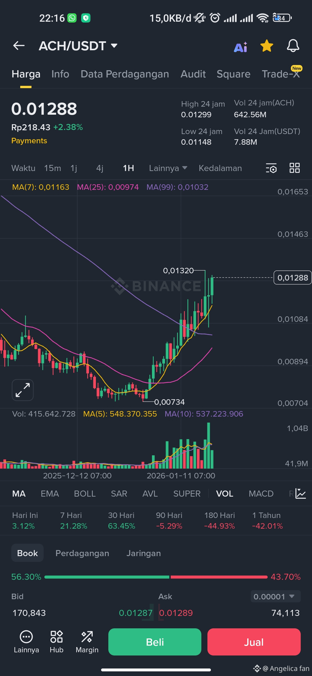 Check out the chart! Alchemy Pay (ACH) baru aja breakout ke 0,01288 dengan kenaikan +2,38%. Sinyal Golden Cross udah makin obvious, ditambah volume beli (56,30%) yang bener-bener mendominasi! 📈
