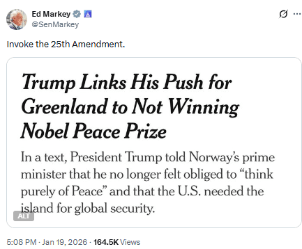 Der liberale Senator Ed Markey aus Massachusetts hat daher Vizepräsident J. D. Vance und Mitglieder des Kabinetts aufgefordert, die Anwendung des 25. Verfassungszusatzes der US-Verfassung zu erwägen – eine Bestimmung, die es ermöglicht, einen Präsidenten für unfähig zu erklären, die Pflichten des Amtes auszuführen.