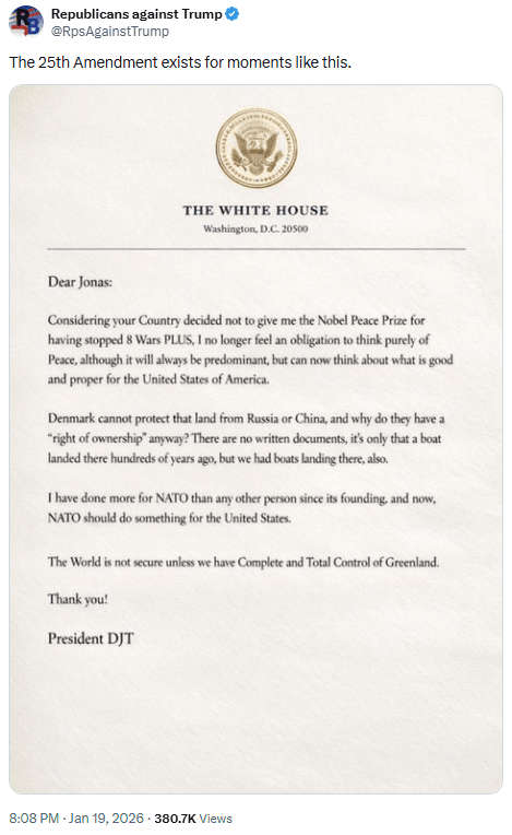 Laut Berichten der New York Times soll Trump europäischen Beamten in privaten Schreiben mitgeteilt haben, dass ihm unfairerweise der Friedensnobelpreis verweigert worden sei, trotz dessen, was er als seine „noblen Bemühungen“ in Bezug auf Grönland beschrieb. In einer Nachricht an den norwegischen Ministerpräsidenten Jonas Gahr Støre soll Trump vorgeschlagen haben, dass er, da der Preis ihm nicht verliehen wurde, sich nicht mehr verpflichtet fühlt, „über Frieden nachzudenken.“