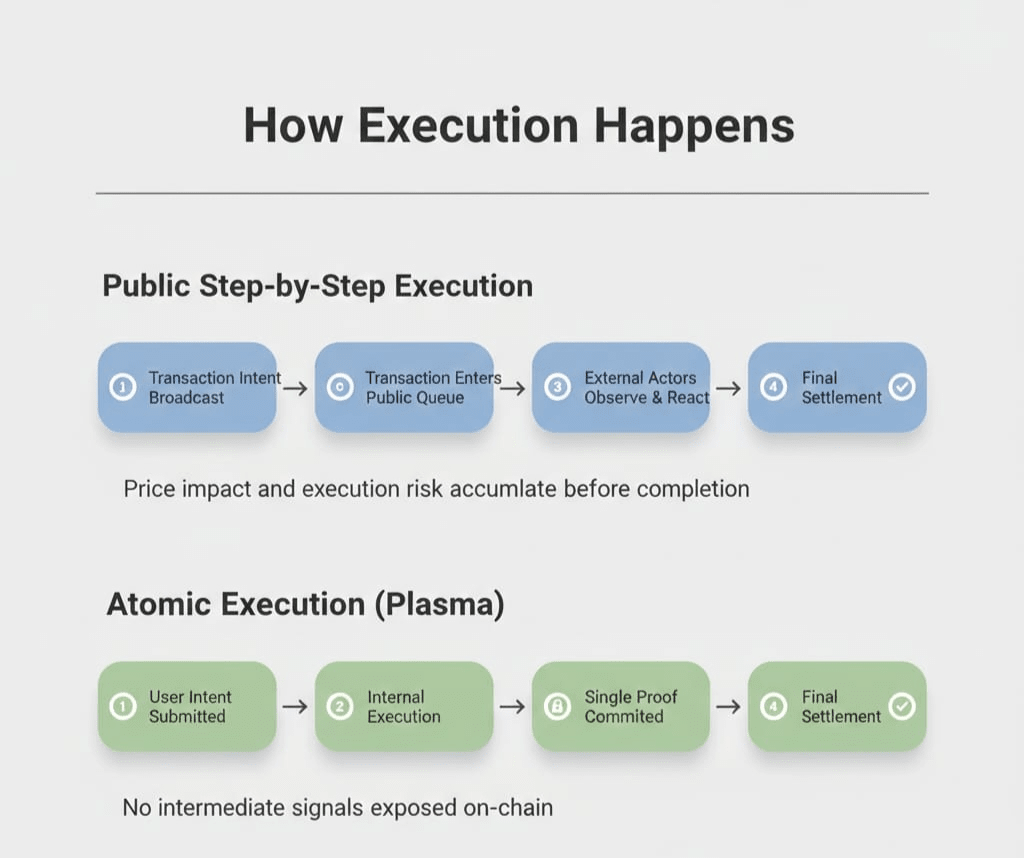 Plasma and modern layer-2 solutions like rollups take a different approach. Instead of revealing every intermediate step, transactions are executed internally first, and only a final proof or batch result is submitted on-chain. There are no early signals, no partial states, and no visible execution trail—only a final, verifiable outcome.