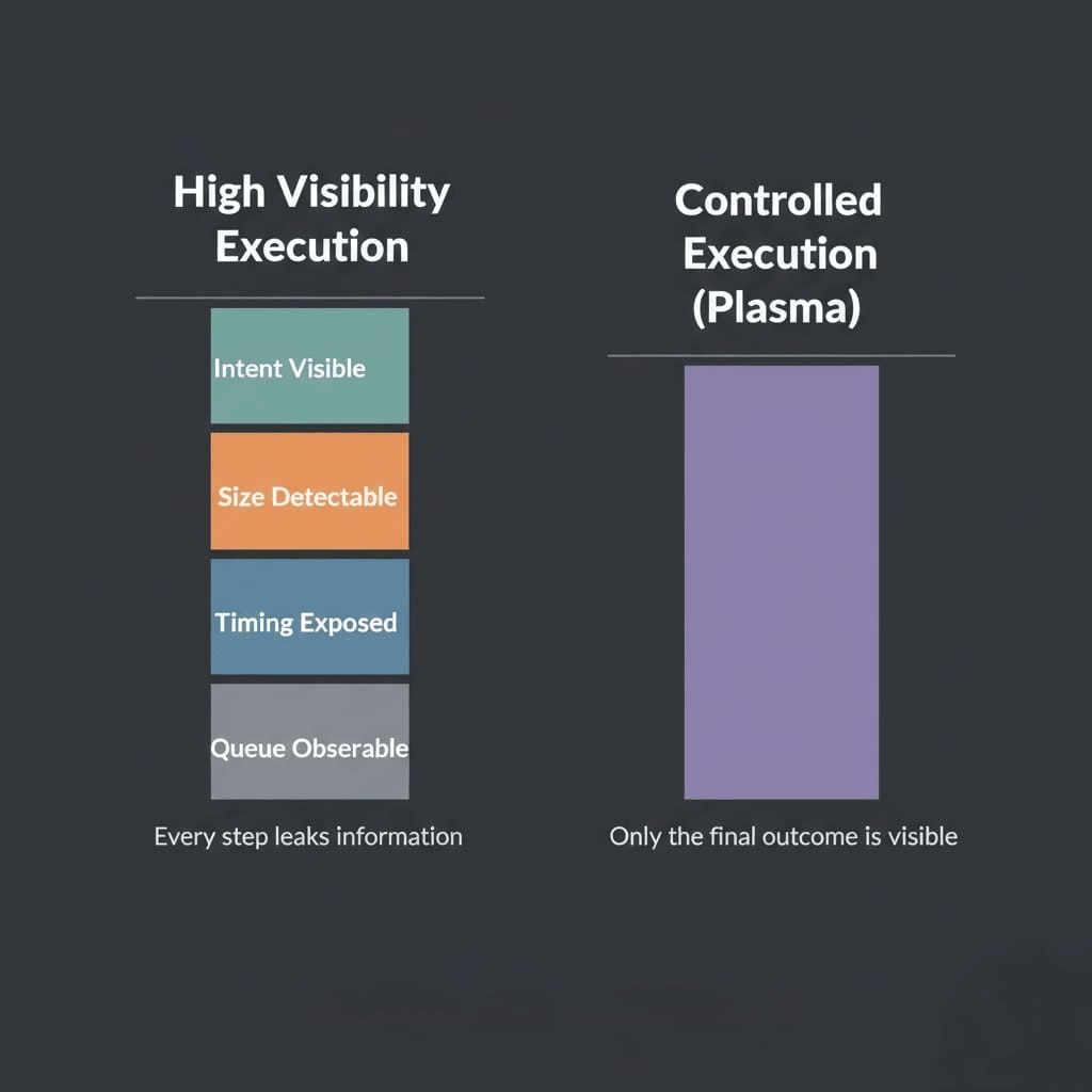 Plasma is the core architecture that protects high-value execution by keeping intermediate steps off-chain and publishing only a final, verifiable outcome. That design is what removes most visibility risk.