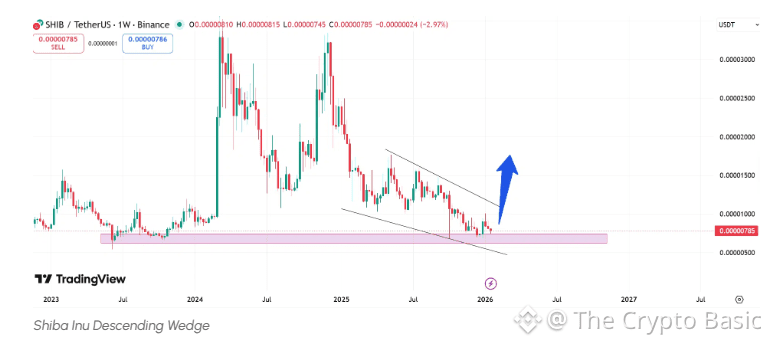 On the daily chart, this accumulation within the descending channel remains in place. The January 5 swing to $0.00001009 saw Shiba Inu make its closest reach for the upper resistance trendline since September 2025.