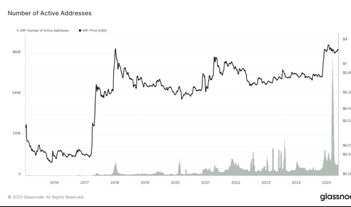 Die Anzahl aktiver Adressen bleibt unter den vorherigen Höchstständen, was darauf hinweist, dass der Preisanstieg noch nicht mit einer starken Expansion der Benutzerbasis einherging.