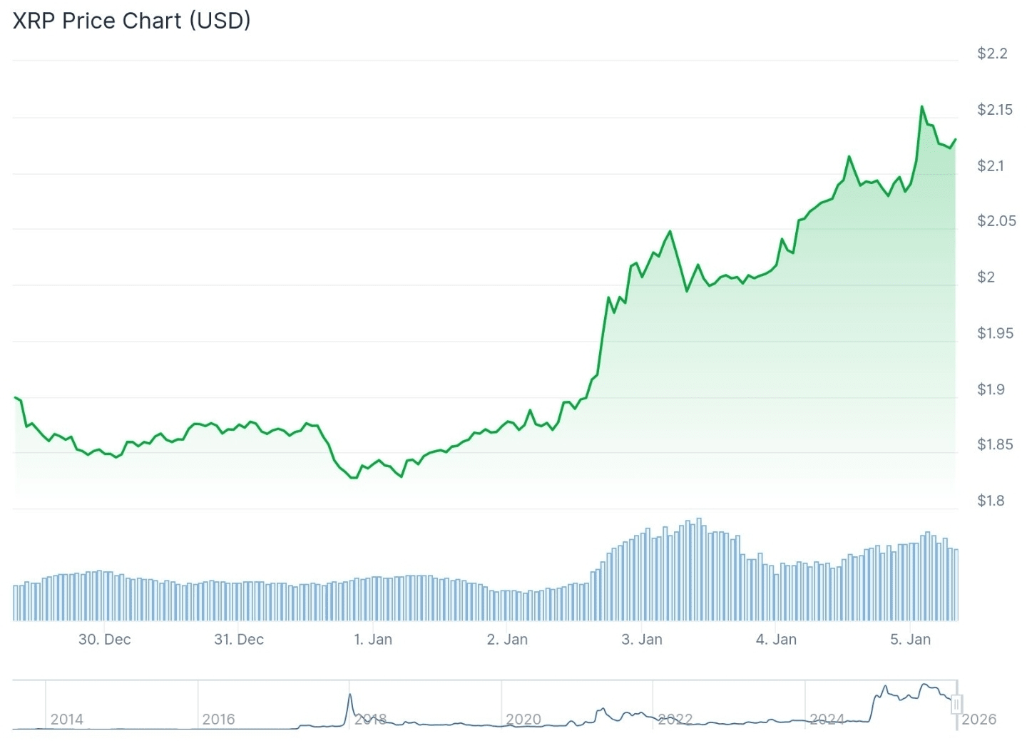 Das Diagramm zeigt den schnellen Anstieg des XRP-Preises von $1.85 auf etwa $2.35 in den ersten Tagen von Januar 2026, unterstützt durch einen deutlichen Anstieg des Handelsvolumens.