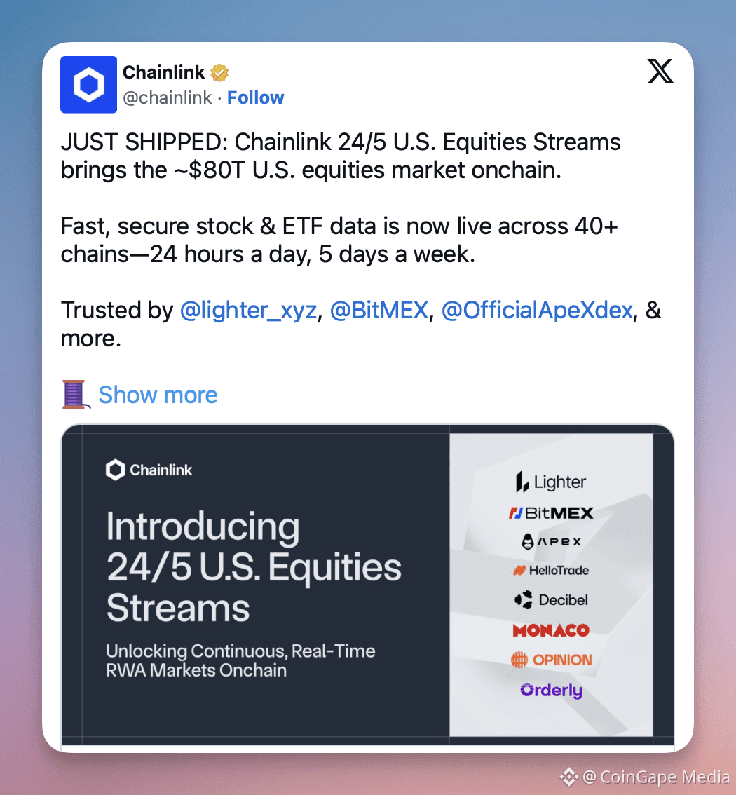 Chainlink has launched its 24/5 U.S. Equities and ETF data feeds, making the $80 trillion U.S. stock market accessible on-chain. These data feeds give real-time data on before-market, normal hours, after-hours, and overnight trading.