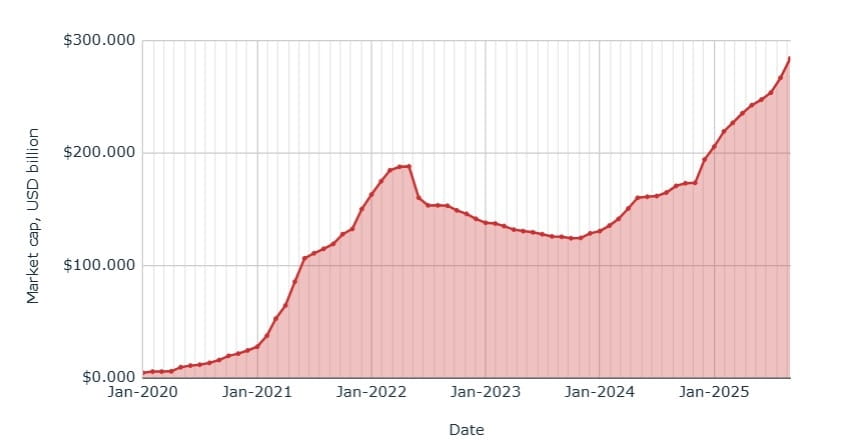 Entwicklung der Marktkapitalisierung der Stablecoins im Laufe der Zeit: (Grafik)