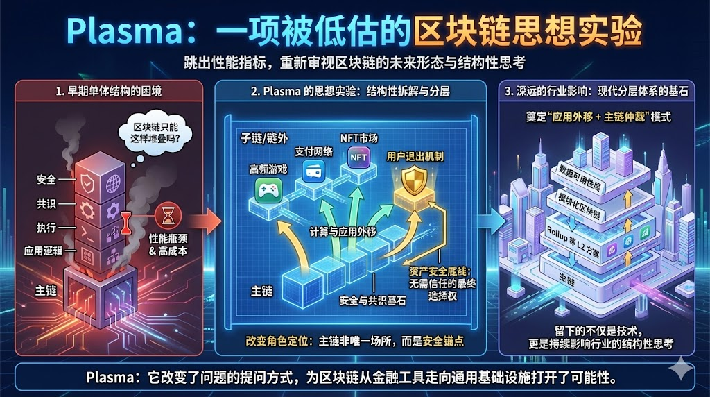 Heute diskutieren wir modulare Blockchains, Datenverfügbarkeitsschichten und die Trennung der Ausführungsschicht; tatsächlich können wir in Plasmas Design frühe Anzeichen dafür finden. Es mag nicht die endgültige Lösung sein, aber es hat die Art und Weise, wie Fragen gestellt werden, verändert.