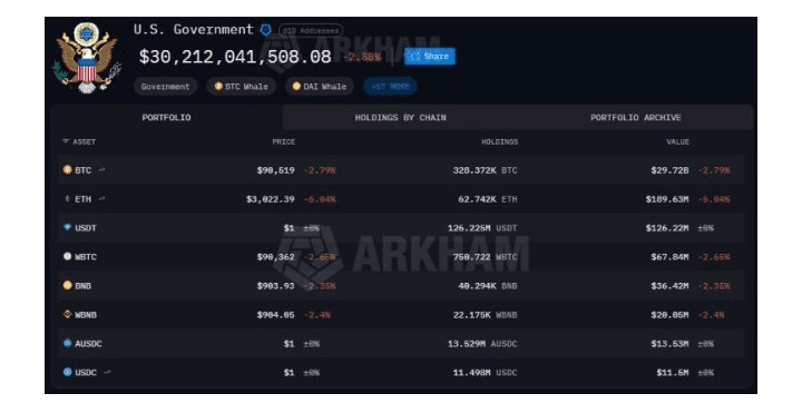 Laut den Daten von Arkham hat die amerikanische Regierung einen Vorrat von 328.372 Bitcoins, die eine Vermögen wert sind — etwa 29,7 Milliarden Dollar oder 158,8 Milliarden Reais.
