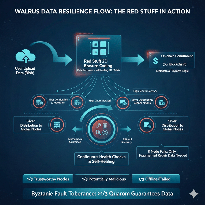Betreten Sie Walrus. Entwickelt von Mysten Labs, fügt Walrus nicht nur "zusätzliche Kopien" Ihrer Daten hinzu. Es nutzt eine mathematische Superkraft namens Rotes Zeug, um sicherzustellen, dass selbst wenn die Mehrheit des Netzwerks verschwindet, Ihre Daten bestehen bleiben.