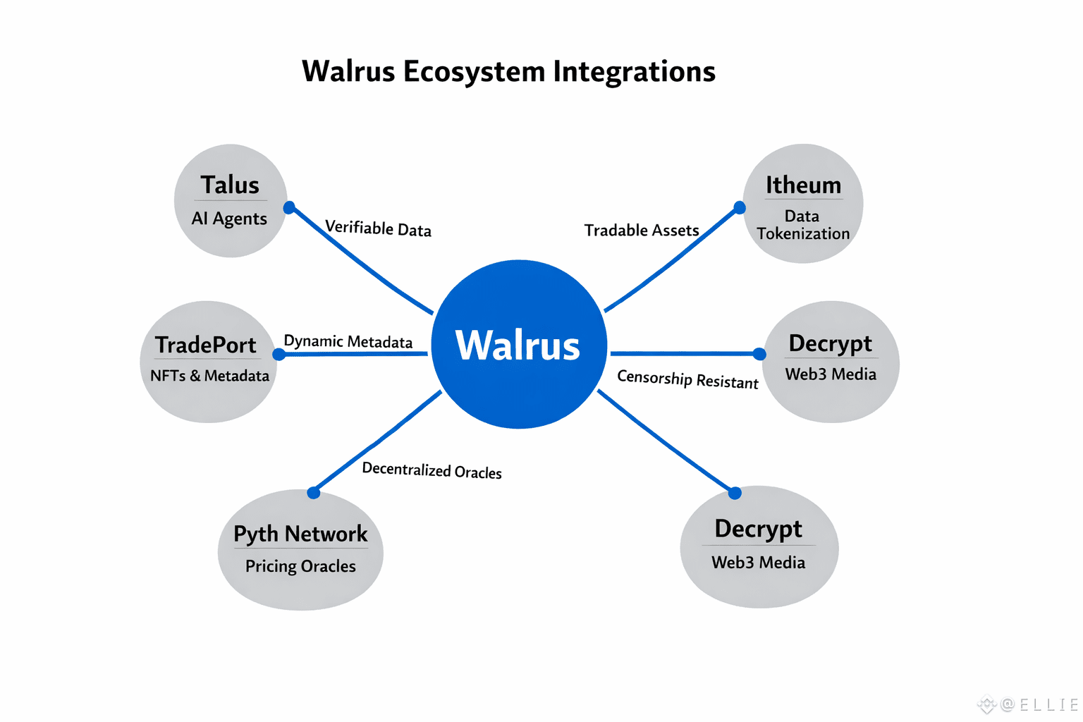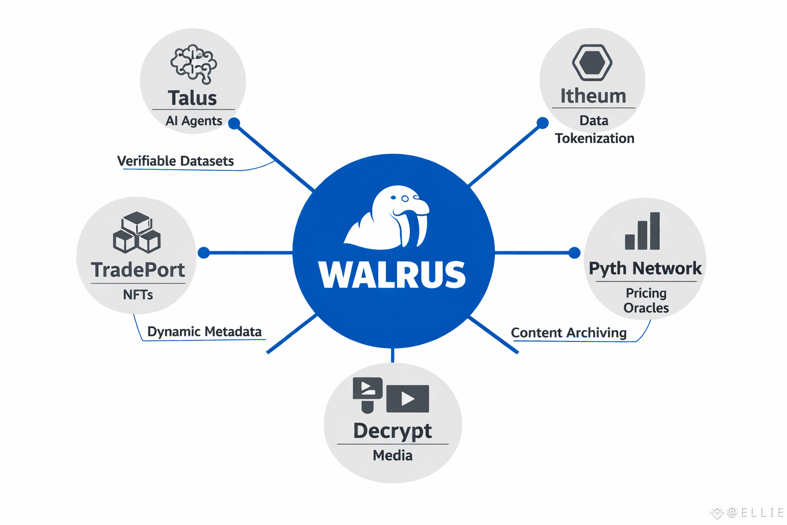 Why does the Walrus ecosystem work so well? It’s chain-agnostic and built on Sui. The team launched on mainnet on March 27, 2025, and came in strong with $140 million from big names like Standard Crypto, a16z crypto, and Franklin Templeton. That funding is fueling their plan to connect with over 100 different blockchains, making Walrus a real interoperability powerhouse. At its core, Walrus moves massive data—4K videos, AI datasets, 3D game files—using Red Stuff erasure coding. It chops data into pieces, backs it up 4.5 times, and keeps everything running even if parts go missing, all with just 5x overhead. It’s efficient, and that’s why so many different projects use it. TradePort’s NFT marketplace relies on Walrus for upgradable metadata, so NFTs can evolve without any central server. Decrypt, a Web3 media leader, keeps articles and videos archived through Walrus for unbreakable access. Even Pudgy Penguins migrated their content to Walrus via Tusky, locking it in for good.