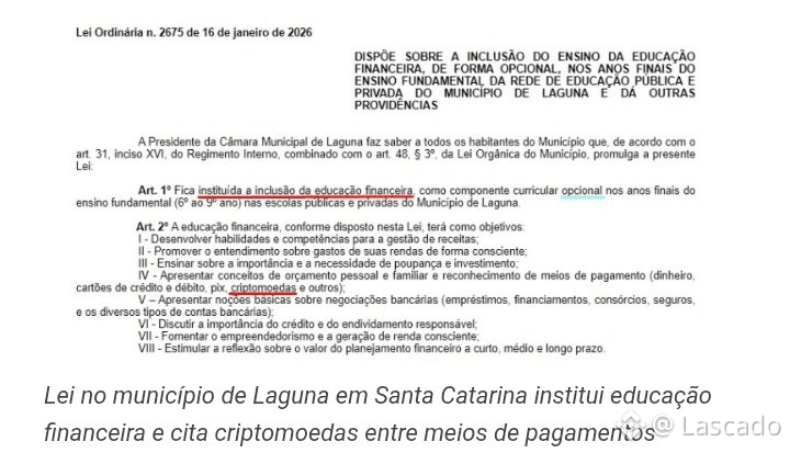 Com a aprovação, os moradores de Laguna podem até estudar criptomoedas como parte da educação financeira. A cidade, que fica a uns 120 km de Florianópolis, é famosa pelas praias, pelo surfe e pela pesca com ajuda dos botos. $ETH $BNB