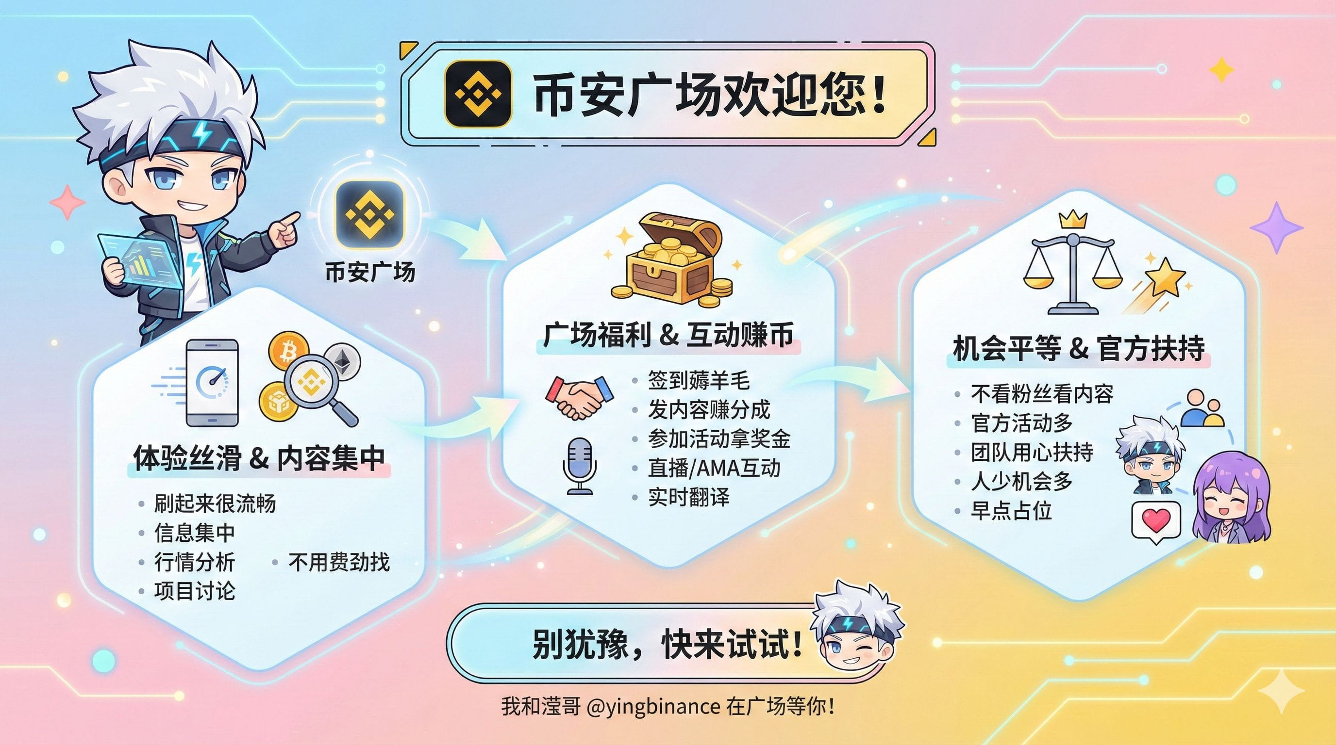 说白了,币安广场不是那种冷冰冰的资讯 APP,而是一个「能边玩边赚、能成长的地方」—— 你在这儿既能学怎么玩币、跟同好交流心得,又能顺便赚点积分、参与活动拿奖励,甚至发点内容赚点零花钱。现在刚开始热闹起来,就像刚开业的新商场,人不多但啥都有,你早点进去逛逛,说不定能赶上「早班车」,以后用着更顺手~