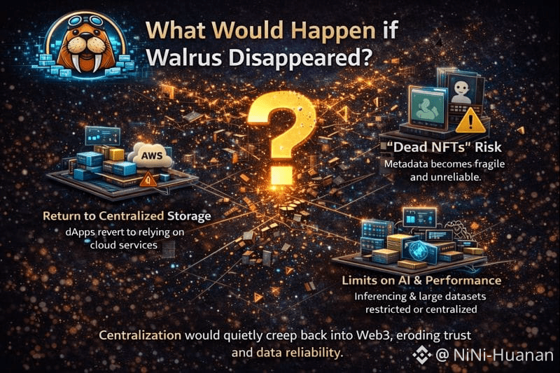 If Walrus vanished, Web3 would not collapse overnight. Applications would keep running, markets would continue trading, and users might not notice an immediate change. But beneath the surface, compromises would accumulate. Centralization would creep back in, data permanence would weaken, and the foundations of Web3 would slowly erode.