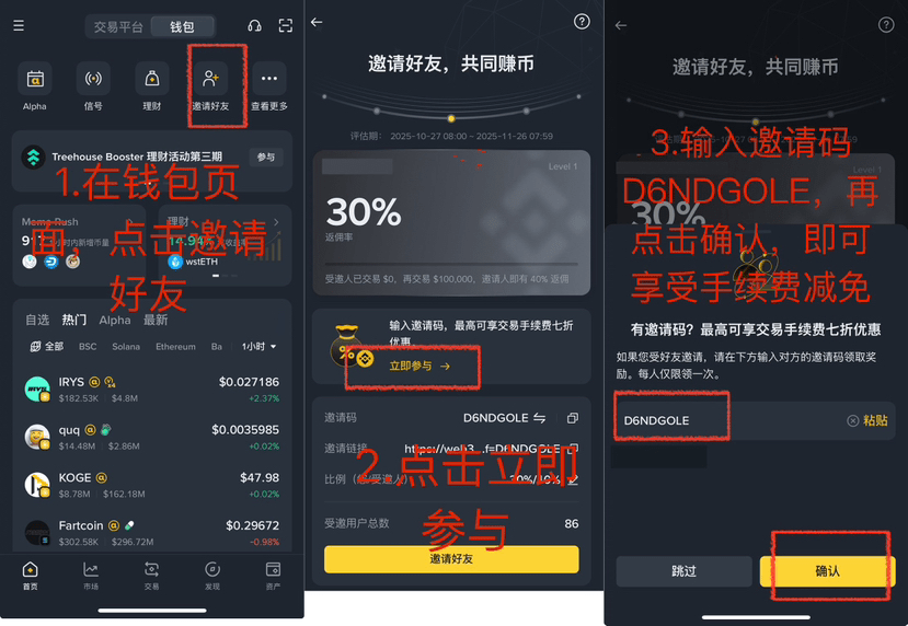 Willkommen, alle, binden Sie den Einladungscode D6NDGOLE für die Binance-Wallet, damit Sie unabhängig davon, ob Sie Aktien-Token kaufen, Meme spielen oder am Alpha-Handelswettbewerb teilnehmen, die Gebühren zurückerstattet bekommen. Die Gebühren werden maximal um 30% reduziert. Je mehr Leute es nutzen, desto mehr Gebühren werden zurückerstattet. Wenn mehr Leute teilnehmen, werde ich die Rückerstattung auf den optimalen Betrag anpassen. Die Anleitung zur Bindung des Einladungscodes für die Binance-Wallet finden Sie in Abbildung zwei.