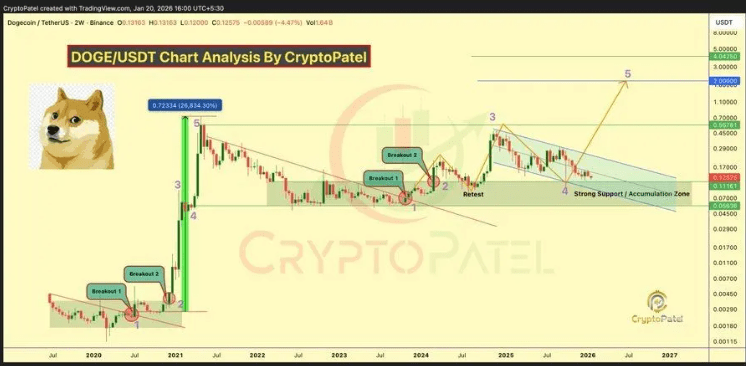 Laut den neuesten Daten des Analysten Crypto Patel befindet sich Dogecoin derzeit in einem wichtigen langfristigen Akkumulationsbereich, dessen Struktur derjenigen vor dem parabolischen Anstieg 2020-2021 sehr ähnlich ist. Das Diagramm zeigt ein wiederkehrendes makroökonomisches Fraktal, bei dem nach einer langfristigen Konsolidierung ein starker impulsiver Anstieg folgt, der zuvor um über 26.000 % gestiegen ist. Nach dem Abschluss der ersten und zweiten Welle sowie dem Höhepunkt der dritten Welle nahe 0,484 USD befindet sich der Preis derzeit in der Konsolidierungsphase. Die aktuelle Marktstruktur deutet darauf hin, dass Dogecoin sich möglicherweise auf die endgültige Expansionsphase des Zyklus vorbereitet, wenn die Nachfrage weiterhin bestehen bleibt.