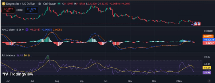 Aus der Tagesansicht zeigt Dogecoin (Dogecoin) einen klaren Abwärtstrend, da der Preis seit dem Höchststand zu Jahresbeginn kontinuierlich niedrigere Hochs und niedrigere Tiefs erreicht. Der Preisverlauf schwächt sich allmählich ab, und nach mehreren gescheiterten Versuchen zur Erholung pendelt Dogecoin derzeit im Bereich von 0,12 USD bis 0,13 USD.