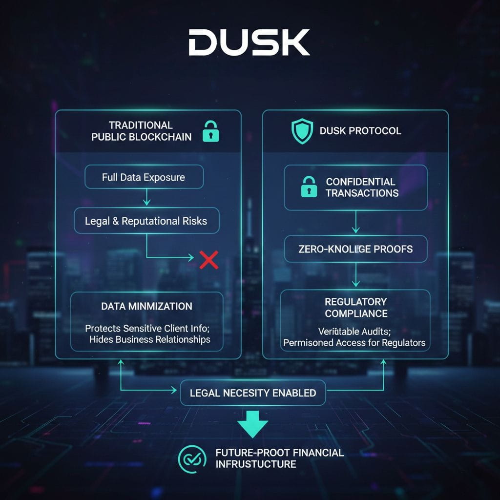 As laws continue to evolve around data protection and financial privacy, infrastructure must evolve with them. Dusk’s privacy-by-design model reflects this shift. By aligning blockchain verification with legal principles of confidentiality and proportional disclosure, Dusk makes privacy not a workaround but a legal necessity built directly into the system.