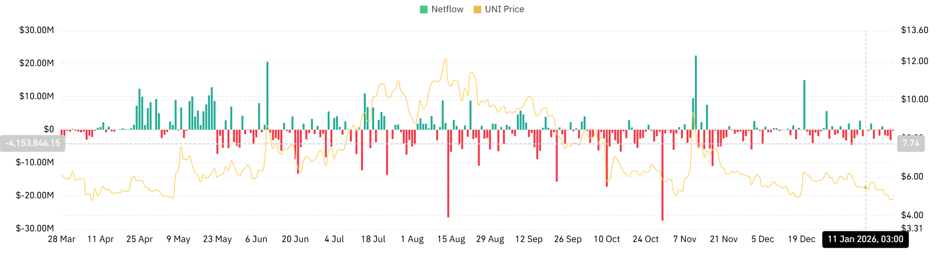 Ein weiteres wichtiges Signal kam von den Spotmarktströmen. Der Spot-Nettofluss von UNI blieb vier aufeinanderfolgende Tage negativ, was auf eine erhöhte Spotnachfrage hinweist. Zum Zeitpunkt des Schreibens lag der Nettofluss bei –290.000 Dollar, eine erhebliche Verbesserung gegenüber –3,13 Millionen Dollar am Vortag.