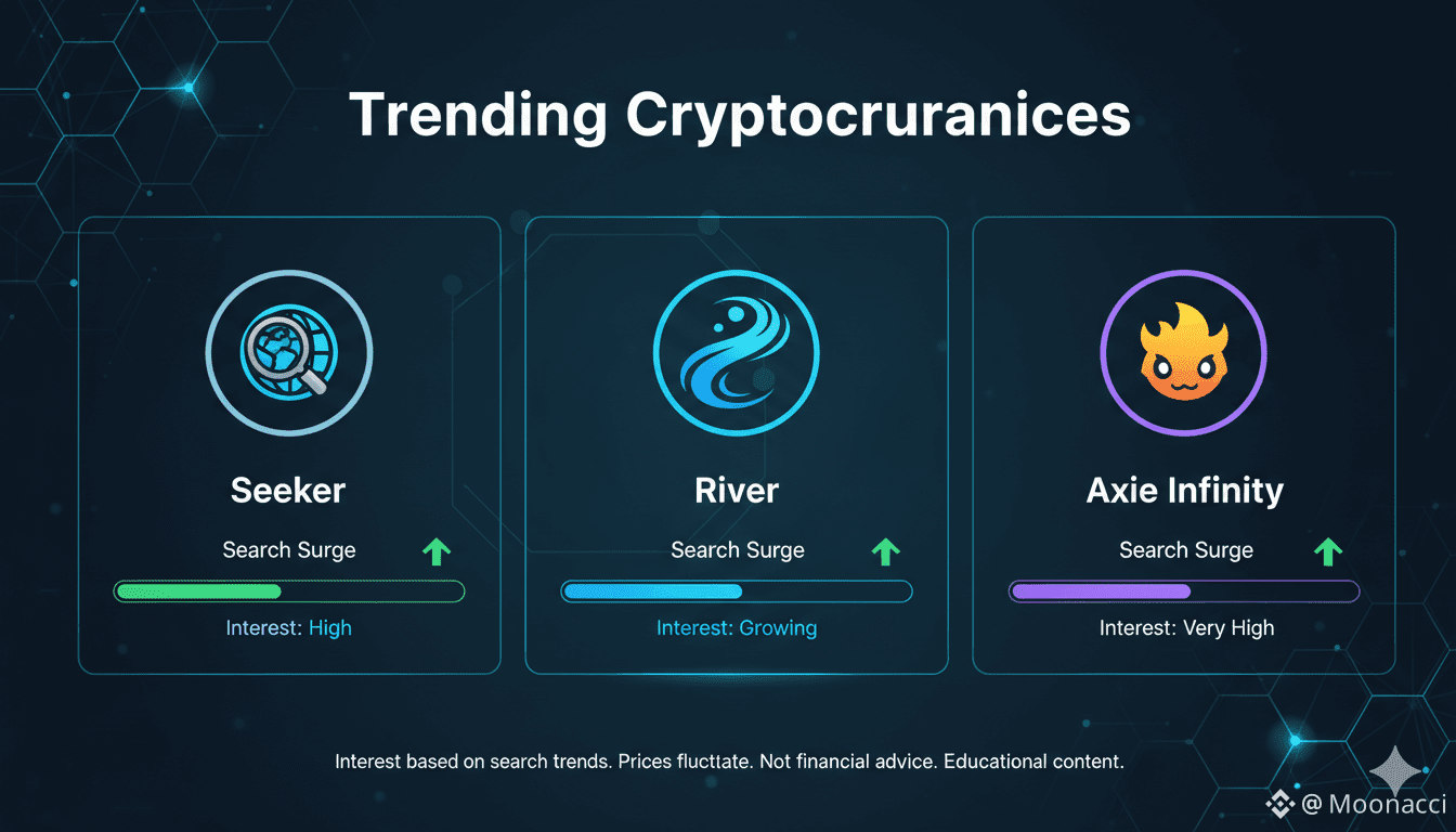 According to CoinGecko’s Top Trending Cryptocurrencies feed, the most searched coins in the last few hours are Seeker, River, and Axie Infinity — each showing notable market action and search activity. Search volume often signals growing community engagement or news catalysts that traders and researchers are watching closely.