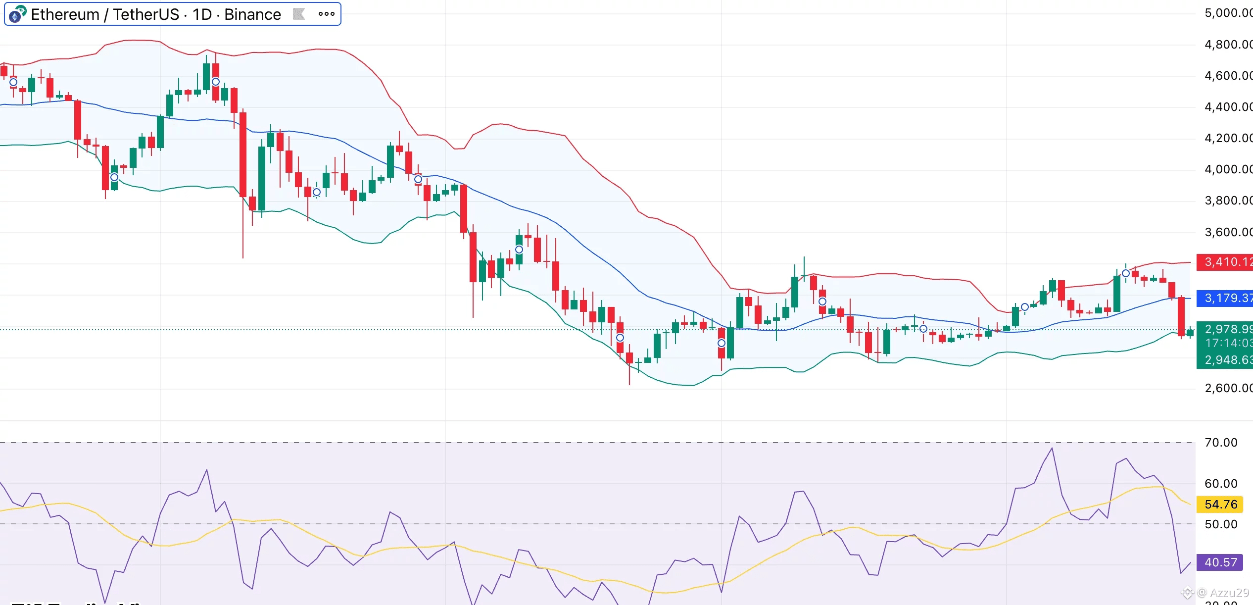 Ethereum’s price structure weakened after it dropped below the $3,000 mark, which had acted as a temporary support during recent consolidation. The latest rally peaked at about $3,400 after being rejected close to the upper Bollinger Band, and then it gradually moved toward the middle of the band.
