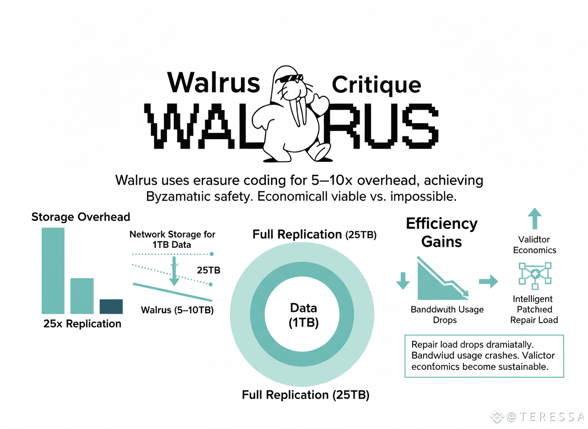 Full replication is defended as proven and simple. It's also economically unworkable at scale. Walrus proves you don't have to choose between safety and efficiency. You get Byzantine fault tolerance with realistic overhead, repair mechanisms that don't burn the network, and economics that enable builders to actually ship applications. That's not theoretical advantage. That's real-world viability. For infrastructure that needs to serve Web3 at scale, this is non-negotiable.