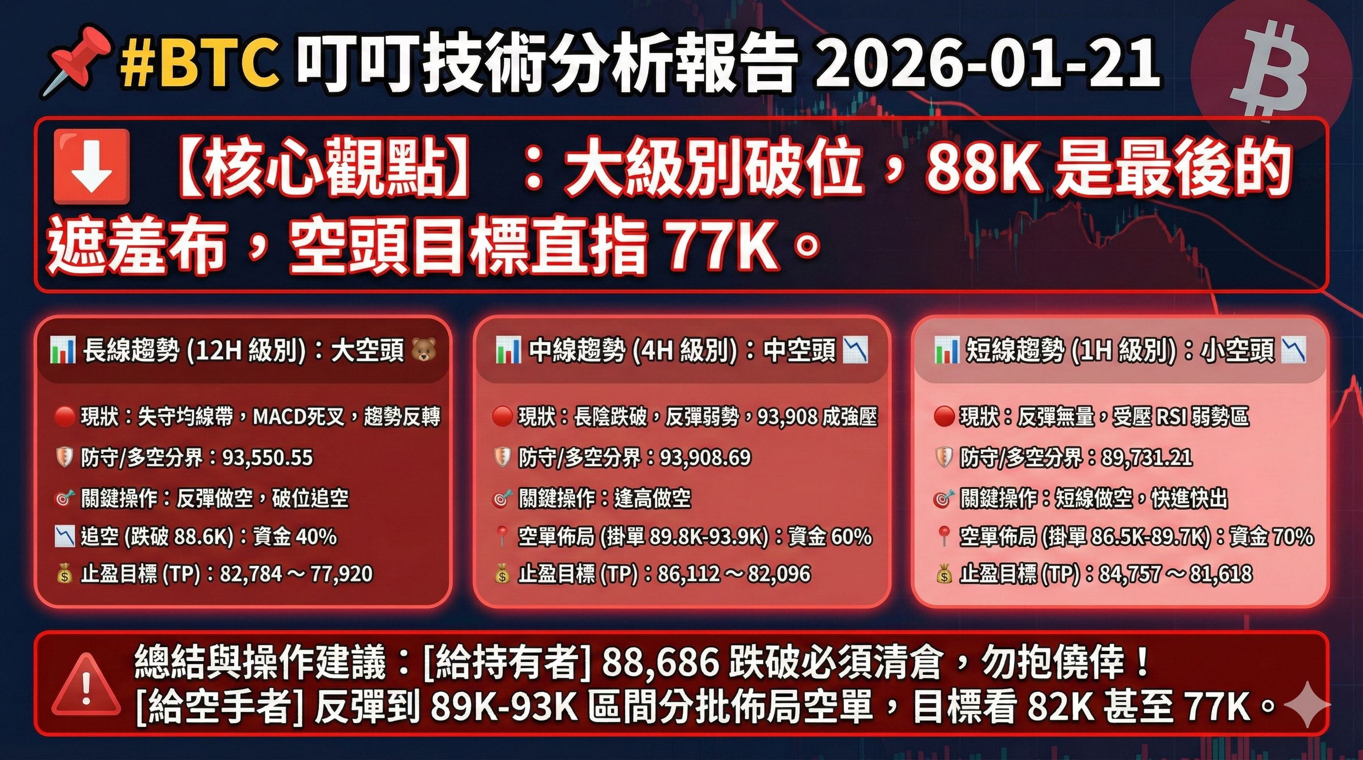 【核心觀點】:大級別破位,88K 成為最後的遮羞布,空頭目標直指 77K。