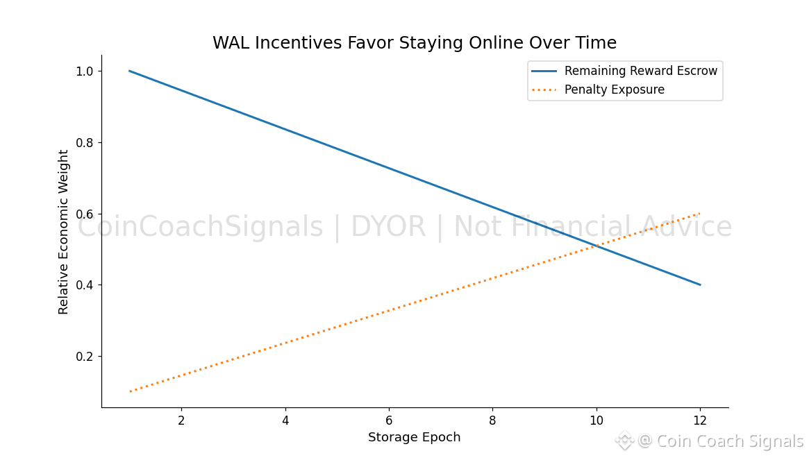 The $WAL token fits into this model without theatrics. It is used to pay for storage over fixed durations, to stake in support of storage nodes, and to participate in governance decisions such as tuning slashing or reward parameters. Rewards are tied to actual availability commitments, not speculative behavior. The token is there to align in practice, incentives so nodes stay online and data remains recoverable, not to manufacture demand.