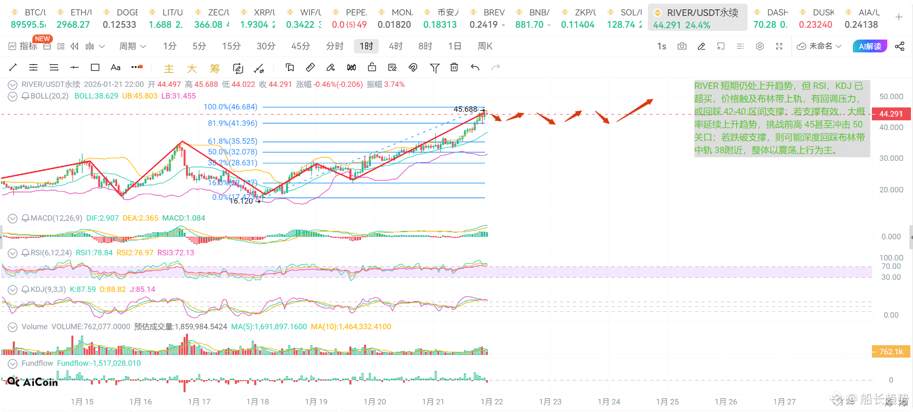 短期看回调,中期看趋势。美联储这个消息来得太巧,正好赶上RIVER技术面需要调整的时候。大概率会借机洗一波盘,回踩到42附近甚至40以下,把不坚定的筹码洗掉。如果站稳,后面还有机会冲高。关键看40守不守得住,守得住就是吃肉机会,守不住就得小心深蹲到38。