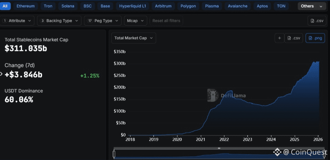 The clearest example is stablecoins. A few years ago, stablecoins were just tools for traders moving in and out of volatile assets. Today, they are being used by businesses, freelancers, exporters, and even families sending money home. In 2025 alone, stablecoins settled more value than major card networks, and a growing portion of that volume came from payments, not trading. That tells you something important. Crypto is no longer only a casino. It is becoming a utility. Here you can see how stablecoins trend is going up only.