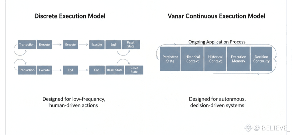 Most legacy chains were built for discrete execution. Each transaction stands alone. State exists, but context does not. That model works when interaction frequency is low and intent is explicitly re-declared every time. It begins to fail when behavior becomes continuous and decision-driven.
