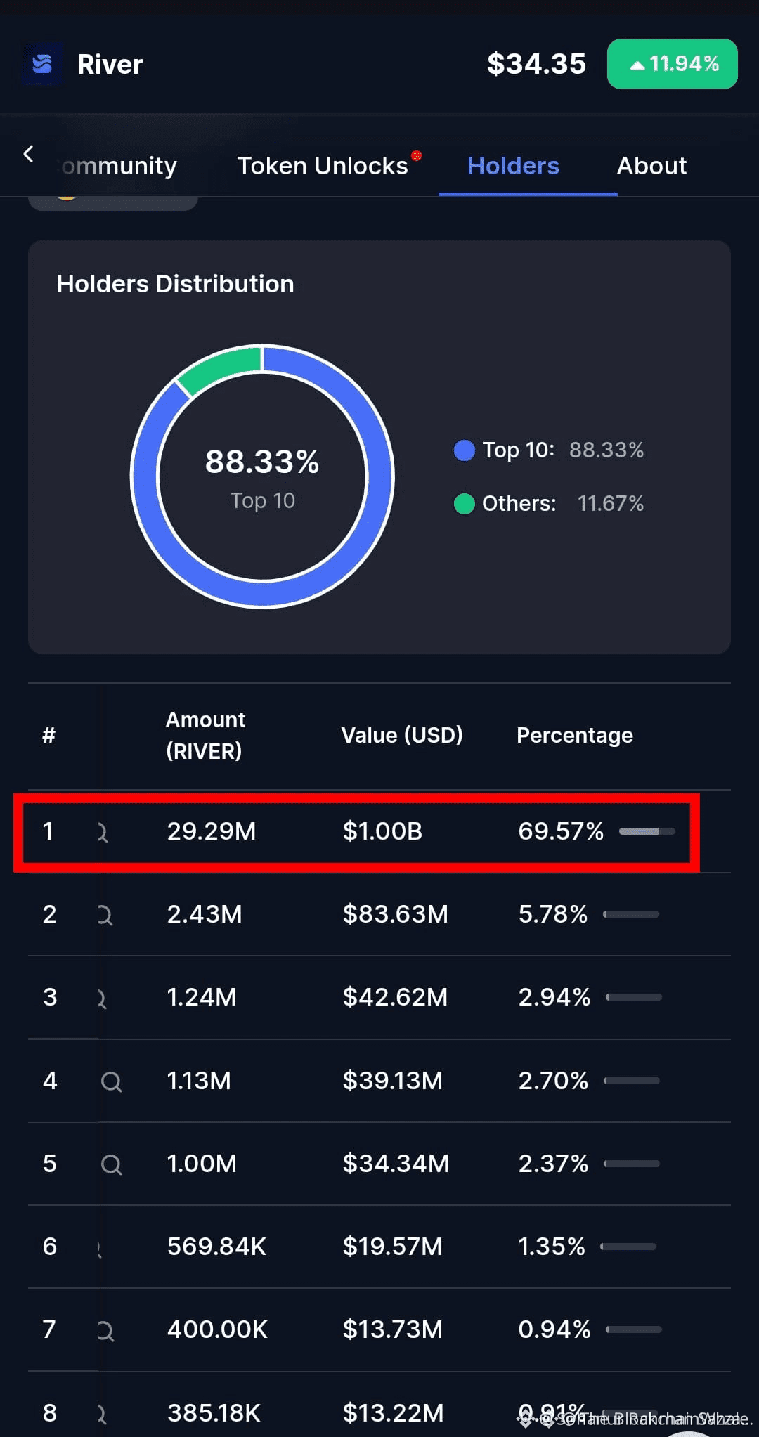 Extreme Concentration: Approximately 69% of the total $RIVER supply is reportedly held in a single wallet.