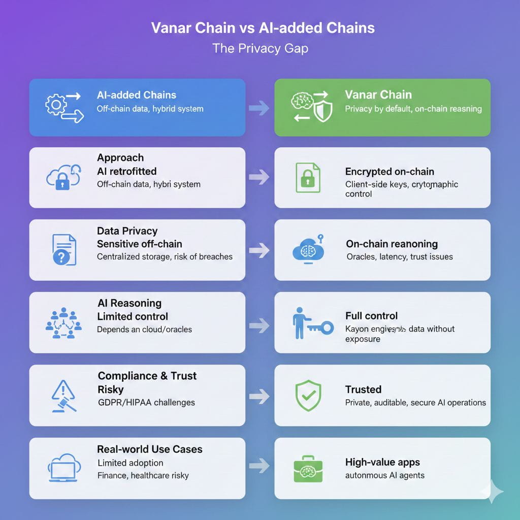 The race to integrate artificial intelligence with blockchain technology is one of the defining trends of the digital era. Yet, as projects rush to market, a critical schism has emerged between two fundamentally different approaches. On one side are "AI-added" chains, traditional blockchains retrofitting AI features onto existing infrastructure. On the other is "AI-first" infrastructure, exemplified by Vanar Chain, which is engineered from the ground up with AI's unique requirements as its core design principle. The most profound and consequential difference between these approaches is a wide, often unbridgeable privacy gap, a gap that will determine which platforms can support the next generation of intelligent, autonomous, and trustworthy applications.