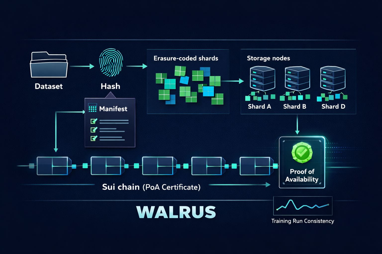 This is where Walrus comes in. Walrus (WAL) is built for big “blob” data, meaning large files like images, video, archives, or full dataset chunks. Instead of parking those blobs on one host and praying, Walrus spreads the job across many storage nodes. The clever bit is that it uses Sui as a control layer for the important “receipt” part: metadata, commitments, and an onchain Proof-of-Availability certificate. In plain words, that certificate is like a public stamp that says, “this exact data was stored and is now owed to the network for reads.”
