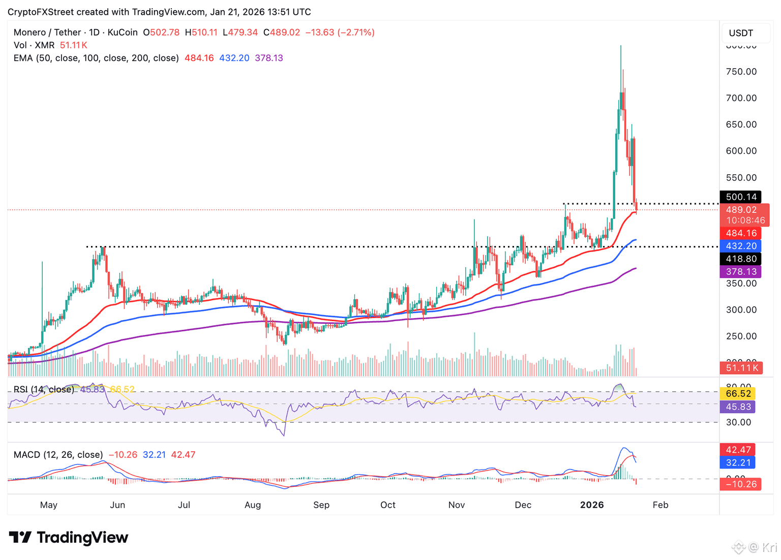 Monero struggles below $500 amid mixed signals in the broader crypto market.