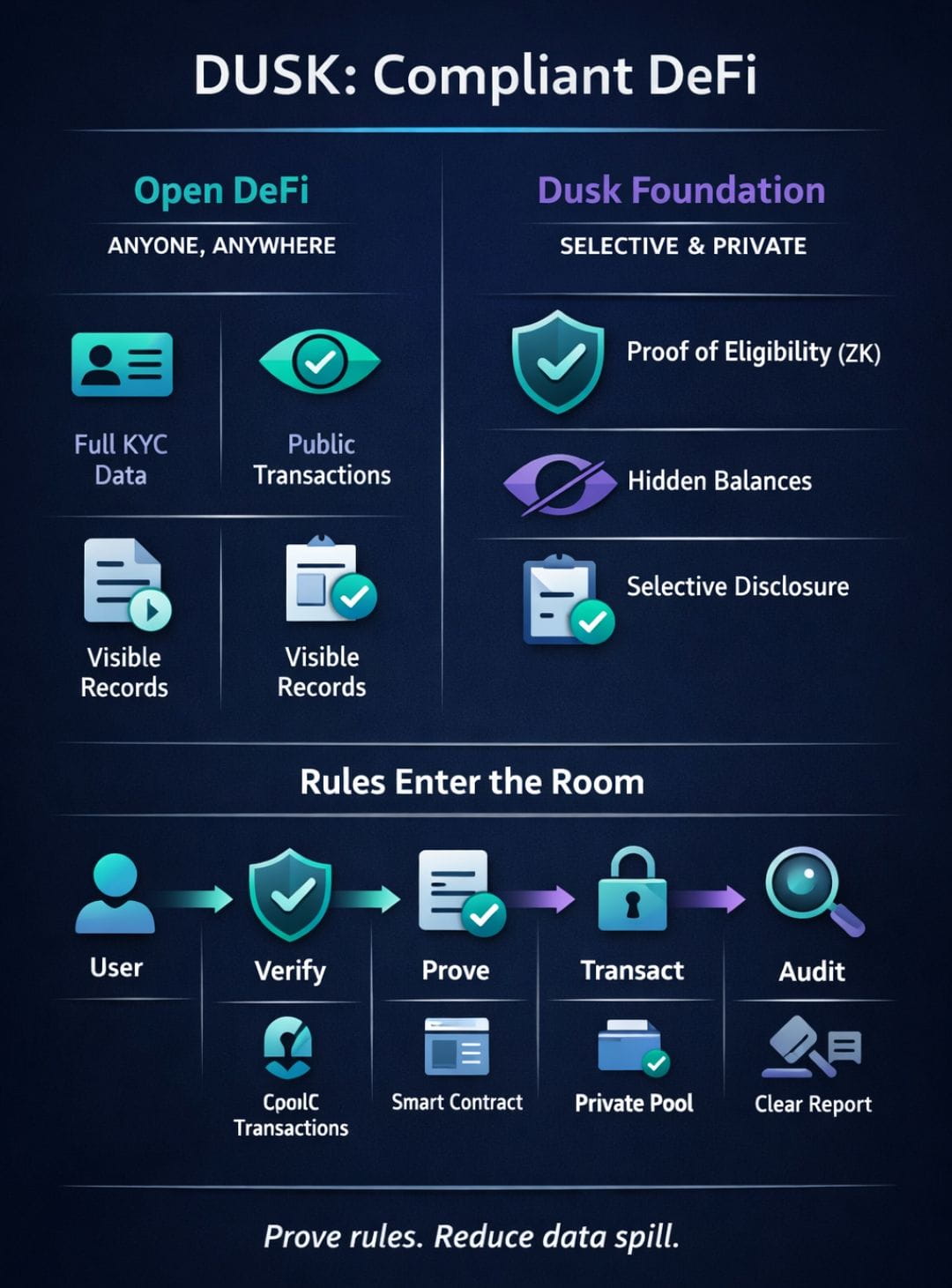 That’s the tension Dusk Foundation (DUSK) keeps poking at: what if we could bring rules in, without turning DeFi into a full-time surveillance machine? Because let’s be honest. Most “compliance” talk in crypto has been clumsy. It often sounds like: “We’ll just KYC everyone and store it somewhere.” That’s not a plan. That’s a leak waiting to happen. It also misses the deeper point. Compliance isn’t just “know the name.” It’s “prove the system behaved.” Did limits work? Did blocked users stay blocked? Did the app prevent bad flow? Did the firm meet its duty? A regulator, or an auditor, doesn’t always need your whole identity story. They need answers to strict questions. This is where Dusk’s framing gets interesting. It treats privacy like a control tool, not a blindfold. A way to share just enough. No extra spill. That “just enough” idea is often done with zero-knowledge proofs. Big name. Simple vibe: you can prove a claim is true without showing the raw facts behind it. Like saying, “I’m over 18,” without showing your birth date. Or “I’m allowed,” without showing your passport scan. It’s not magic. It’s math used with discipline. And once you accept that idea, compliant DeFi starts to look less like a contradiction and more like a design problem you can solve. First, the user journey changes. In open DeFi, you show up and trade. In compliant DeFi, you show up and qualify. That word “qualify” sounds harsh, but it’s normal in finance. It can mean you passed KYC. Or you’re not from a restricted place. Or you’re within a risk tier. Or you’re part of an allowlist. The key detail is where that info lives. If the system stores identity data on-chain, that’s permanent exposure. If the system uses proofs, the chain can verify the rule without holding the private file. That’s the Dusk-style direction: rules can be enforced, but the chain doesn’t become a public filing cabinet. Second, liquidity becomes “clean” by design. In normal DeFi, liquidity is like rainwater in the street. It flows everywhere, mixes with everything. In compliant settings, money can’t mix freely. A fund may need to prove its funds come from approved sources. A platform may need to show controls against sanctioned flow. That creates “permissioned pools” or “gated markets.” People get nervous when they hear “permissioned,” like it automatically means centralized. But permissioned can mean rule-based access, not single-party control. The trick is making that access check verifiable and fair. That’s where privacy tech matters. It can stop the check from becoming a doxx event. Third, the meaning of “audit” changes. Traditional finance is used to audits that pull files, review logs, check controls. Public blockchains give you the opposite problem: too much public data, but not in the form compliance wants. You can see transfers, but you can’t always tie them to legal duties in a clean way. Compliant DeFi wants audit trails that answer specific questions. Not full exposure. Dusk’s core idea lines up here: selective disclosure. Reveal what’s needed, to who needs it, when they need it. Think of it like a folder with tabs. You don’t dump the whole folder on the table. You open tab 3 only. The rest stays shut. Now here’s the part people don’t say out loud: rules also change incentives. In open DeFi, the fastest growth often comes from letting everyone in and letting everything happen. In compliant DeFi, growth can come from trust. Not “trust me,” but “this system can prove it did the right thing.” That attracts a different crowd. Firms that need guardrails. Funds that can’t touch a protocol unless they can explain it to a board. Real issuers that don’t want their cap table and cash flow visible to the whole internet. But it’s not free. The UX gets more steps. The system design gets heavier. The culture shifts too. Some users will hate it. They’ll say it’s not “real DeFi.” And sometimes they’ll be right, depending on what they value most. The question is not who is morally correct. The question is: what DeFi do you want to exist five years from now? Because rules are already in the room. The only choice left is whether DeFi pretends it can’t see them… or learns how to live with them without becoming a data-hungry mess. Dusk Foundation’s pitch is basically that: build DeFi that can pass a serious compliance conversation without forcing everyone to strip naked in public. Privacy as restraint. Compliance as structure. A system that can say, “Yes, the rule is met,” while still saying, “No, you don’t get my whole life.” Not Financial Advice. So, if “compliant DeFi” sounds like an oxymoron to you… maybe the real oxymoron is thinking DeFi can scale into the real world while ignoring the room it’s trying to enter.